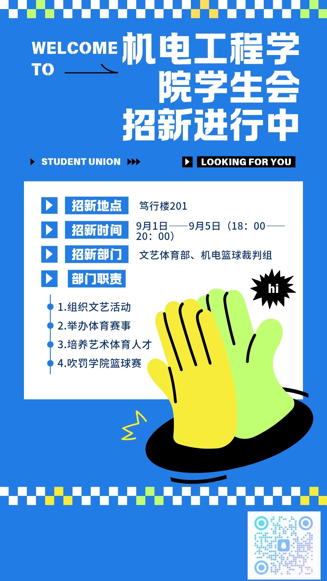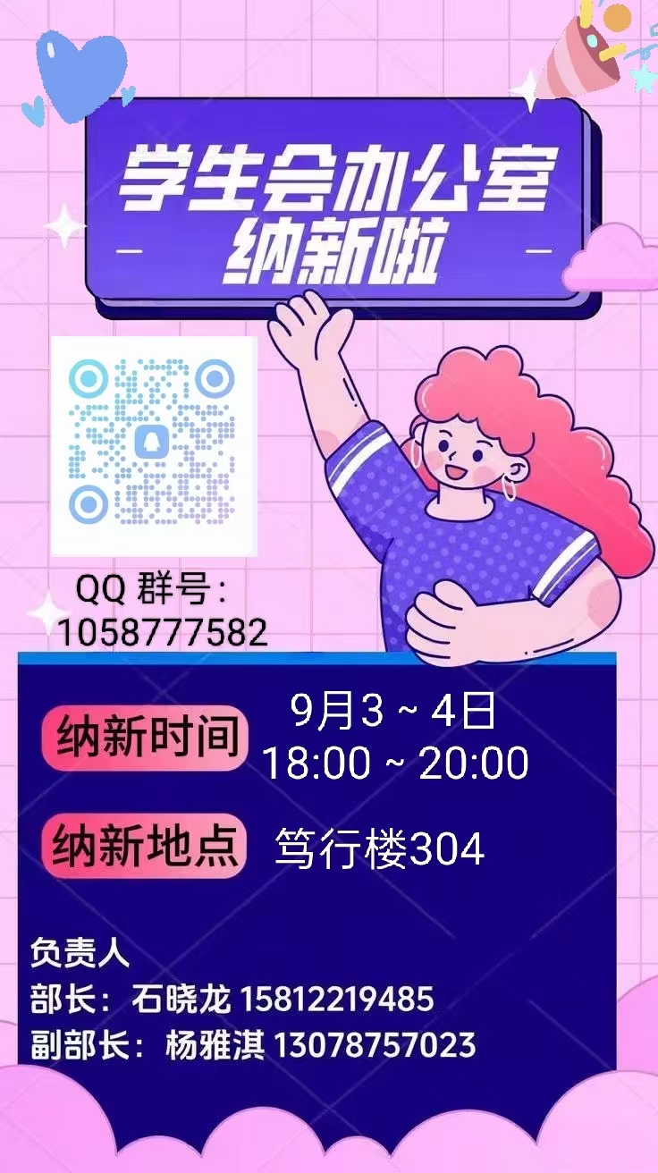 主要职责活动场地申请、现场座次安排、横幅打印、活动PPT制作、水牌打印、邀请函呈送、资料存档、会议通知及布置。加入我们,一起忙在机电!