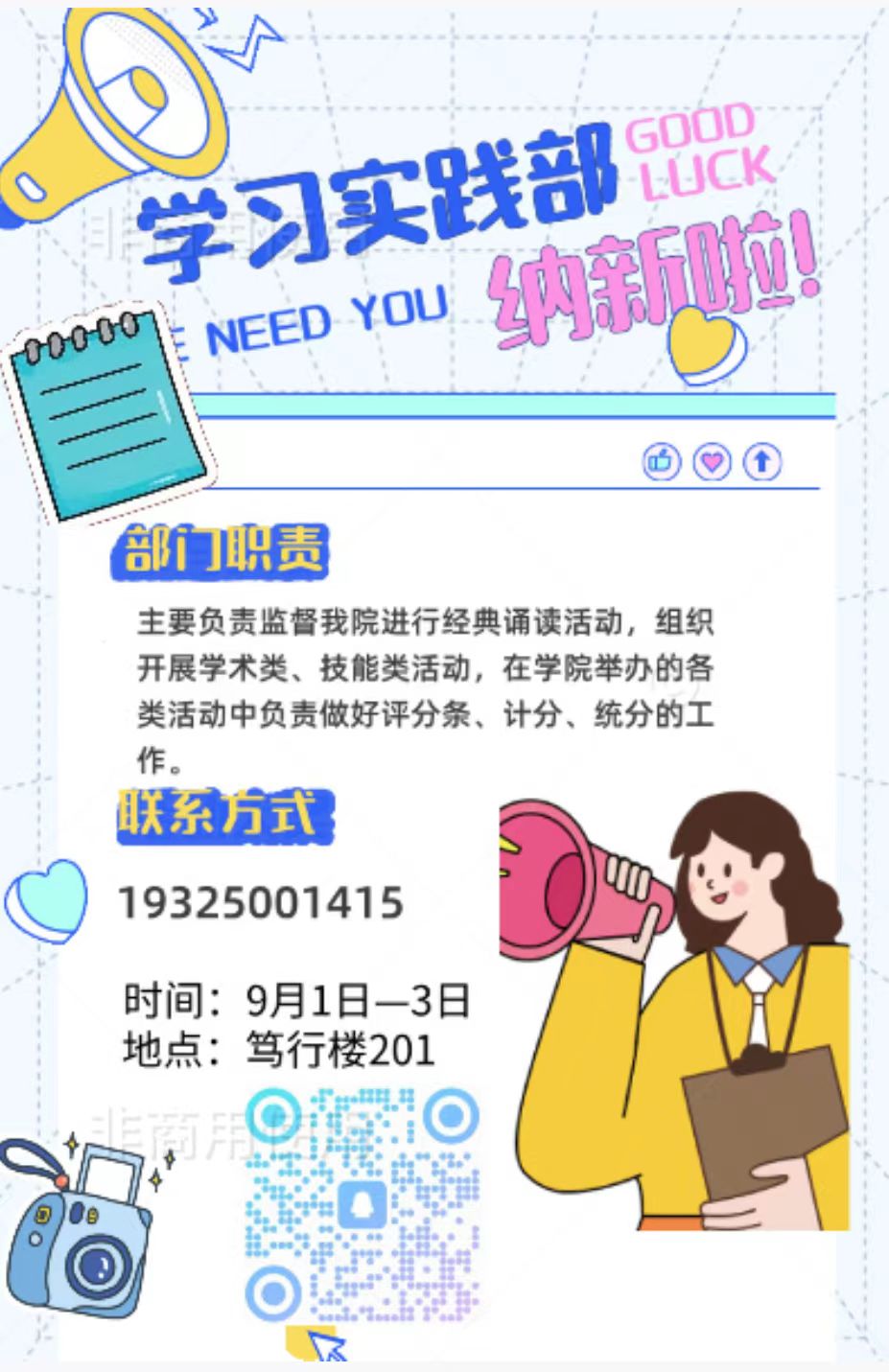学习实践部主要职责:主要负责监督我院进行经典诵读活动,组织开展学术类、技能类活动,在学院举办的各类活动中负责做好评分条、计分、统分的工作。诚邀各位新同学加入我们,共赴美好未来!